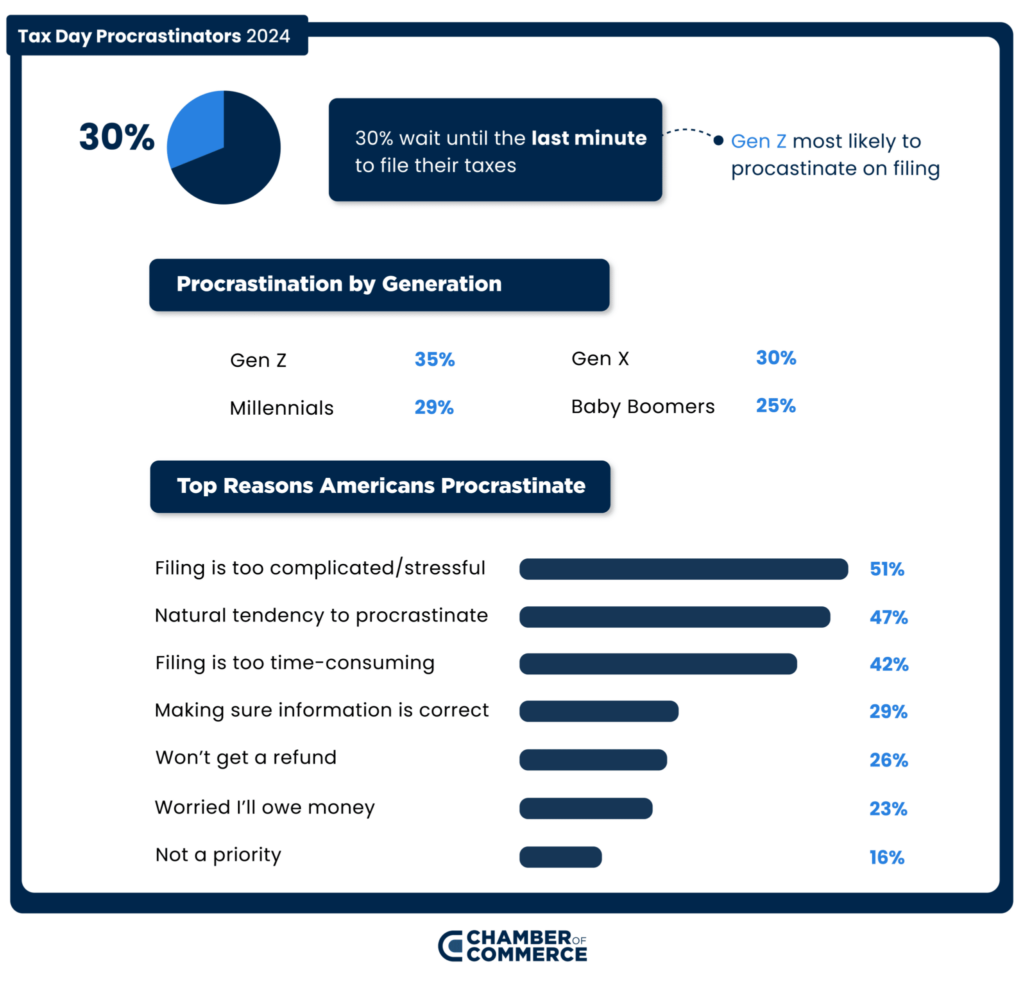 The primary reason Americans procrastinate on filing is because they find the process to be too complicated and stressful (51%). Additionally, 47% say they have a natural tendency to procrastinate, and 42% say filing taxes is just too time-consuming, so they put it off until the final hour.